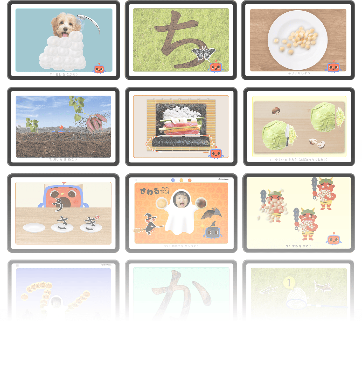さわるTECHは、遊びながら非認知能力を育む新しいデジタル体験。収穫や大工、楽器体験など、感触を通じた遊びが、「現実でもやってみたい!」という好奇心や「実際はどうなんだろう?」という自由な発想や創造力につながっていきます。